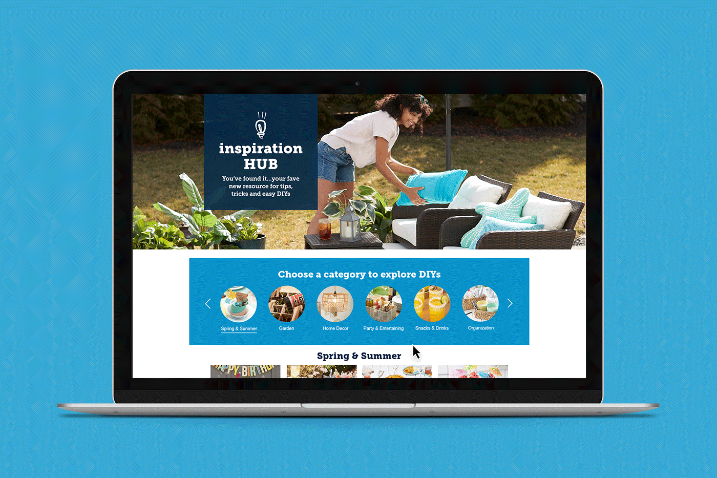 For this 2022 redesign, 20+ web widgets were created that could be utilized for home, category and department pages. Widgets incorporated a mix of branding, seasonality and other relevant marketing messaging. This redesign accomplished a simple, modernized look with updated full width specs. Additionally, the Inspiration Hub was designed to provide customers with a destination for hacks and fun tips on our non-ecommerce site. Customers can browse by category, view instructions, supplies needed and feel encouraged to shop in store.